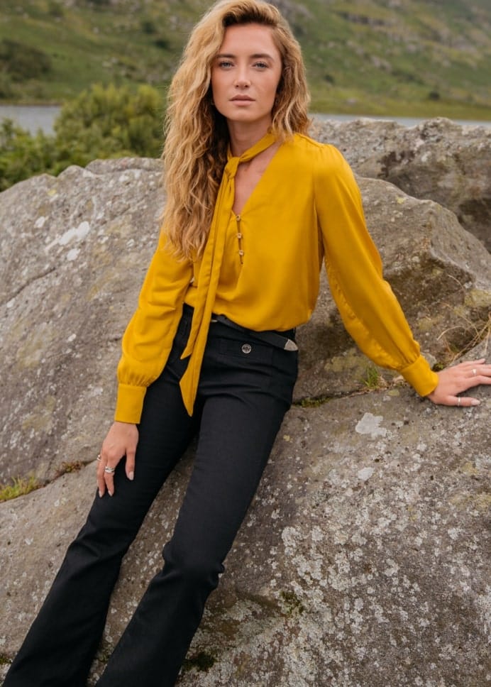 Polished gold button detailing on the shoulders adds a touch of sophistication.
